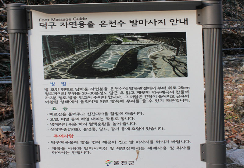 덕구온천은 태백산맥의 주능선을 이루는 응봉산 남쪽 자락, 1일 용출량은 약 300톤, 수온은 43℃이다. 중탄산나트륨이 다량 함유된 온천으로, 신경통·당뇨병·소화불량·빈혈 등에 효과가 있다고 하며, 특히 피부병과 근육의 피로를 푸는데 탁월하다고 한다.