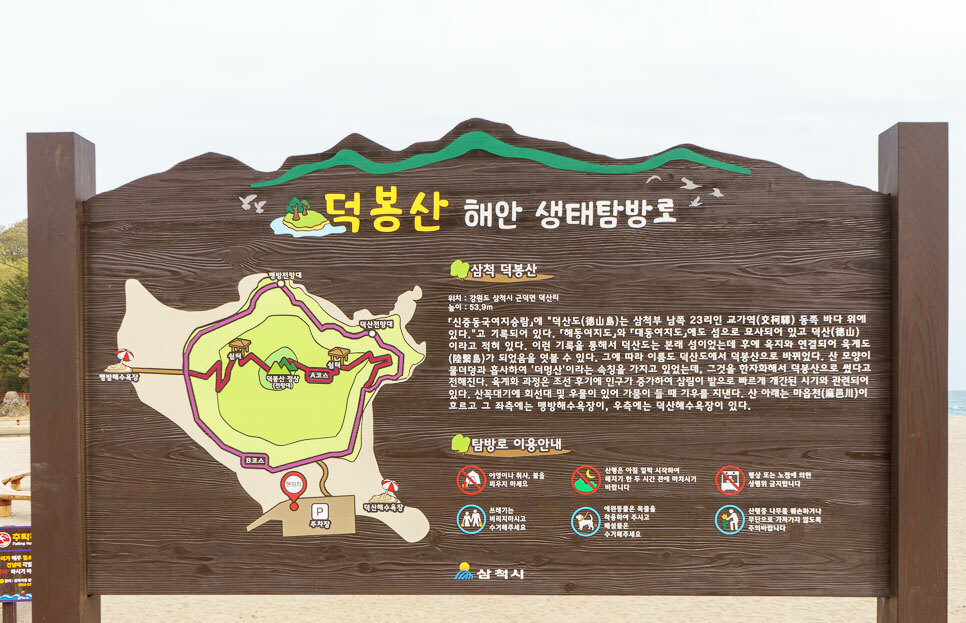 덕봉산은 삼척 노곡면 상마읍리에서 발원한 마읍천이 동해로 흘러드는 근덕면 덕산리에 자리한다. 멀리서 보면 마치 섬처럼 떠 있는 것 같아 ‘바다 위의 산’이라 불린다. 해발 53.9m의 낮은 산이지만 맹방 해변과 덕산 해변 사이에 위치해 정상에서 바라보는 경관이 장쾌하다. 이처럼 아름다운 풍경을 품은 덕봉산은 53년간 베일에 싸여 있었다. 1968년 울진·삼척지구 무장공비 침투 사건 이후 군부대 해안 철책선으로 가로막혔기 때문이다. 지난 4월 덕봉산 해안생태탐방로가 개방되면서 53년 만에 덕봉산의 진풍경을 누구나 즐길 수 있게 되었다.대나무 숲이 우거진 산책로를 따라 전망대로 올라가는 내륙코스(317m)와 해상 기암괴석을 감상할 수 있는 해안코스(626m)로 구성되어 있으며 산책로를 따라 정상에 오르면 상쾌한 해풍과 함께 탁 트인 바다 풍경과 맹방해변, 덕산해변을 한 눈에 감상할 수 있다.