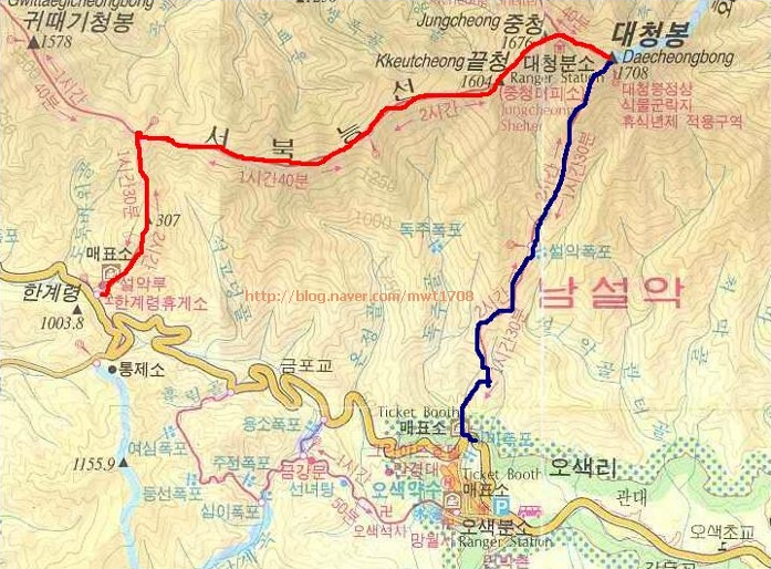 한계령휴게소(920m) - 한계[삼] - 끝청 - 중청대피소 - 대청봉(1,708m) - 남설악탐방소(450m)